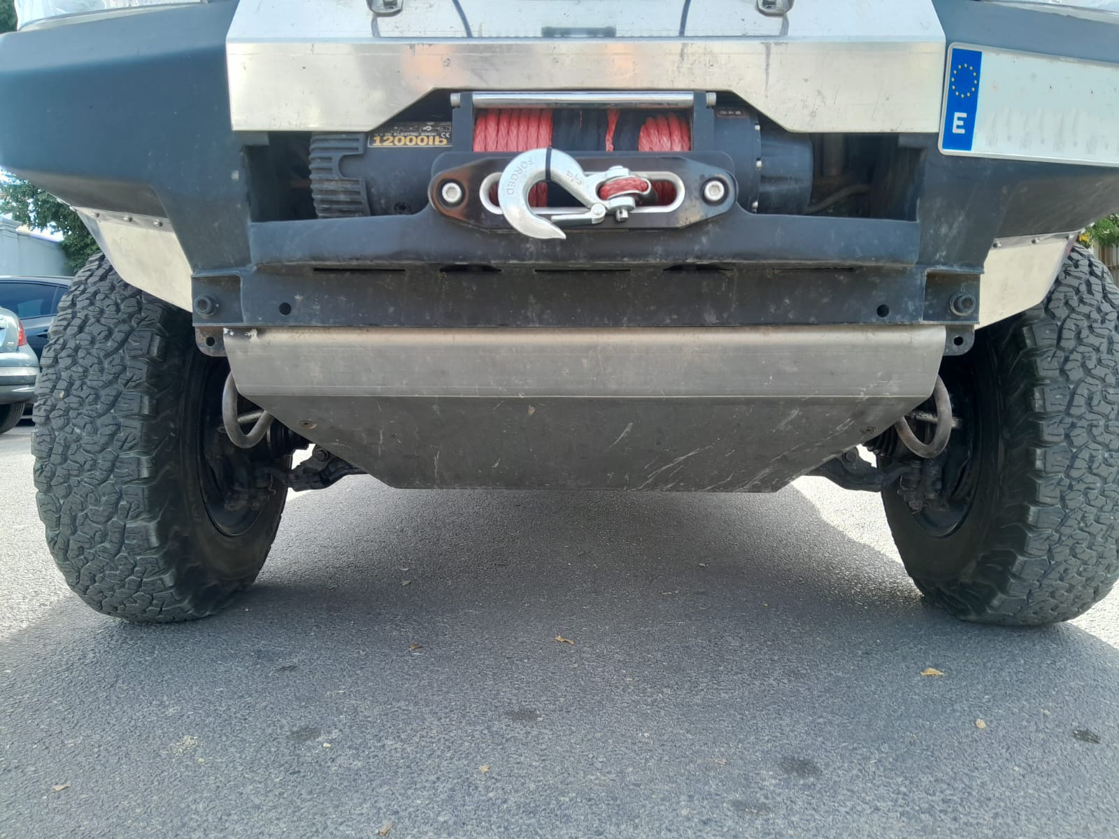 Homologación de paragolpes delantero y trasero metálicos, reubicación de placas de matrícula y estriberas laterales artesanales. Instalación de cabestrante de 12.000 lbs. Modificación sistema de suspensión e instalación de focos led delanteros